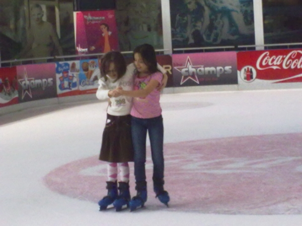 Descriere: colega mea ma invata pasi noi de balet pe gheata. Ceilalti alearga. Suntem fericiti!