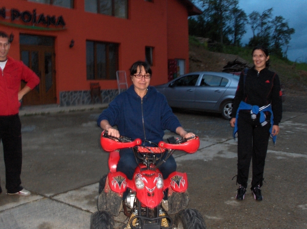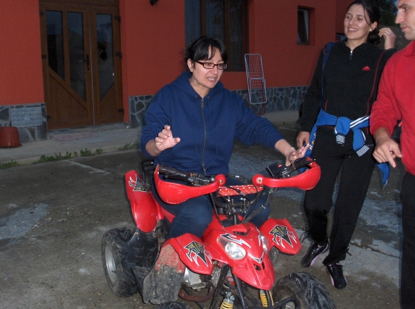 Descriere: Una dintre doamnele invatatoare care ne-a insotit in excursie a incercat cu curaj mersul, pentru prima data pe un ATV sub supravegherea proprietarei.