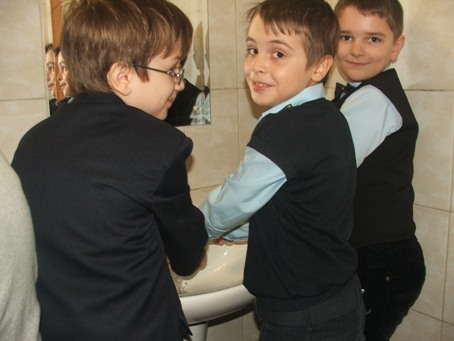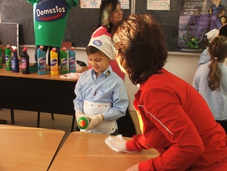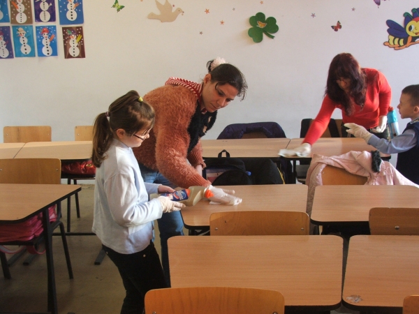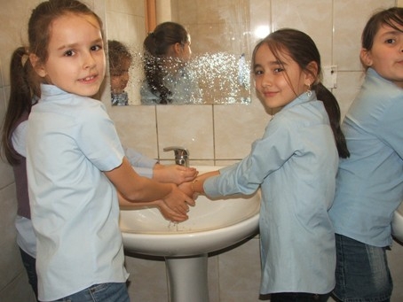 Descriere: In educatia noastra nu uitam ca inainte de a servi gustarea de la ora 10,00 trebuie sa ne dezinfectam sau sa ne spalam mainile. Uneori, parintii se alatura personalului de ingrijire al scolii participand la igienizarea salilor de clasa.