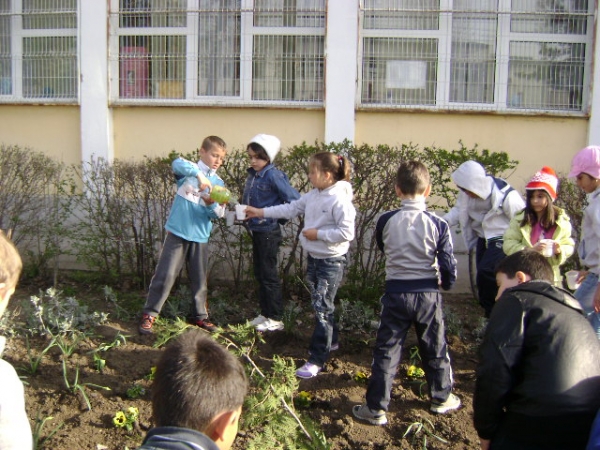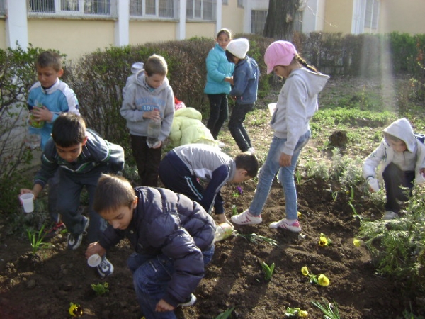 Descriere: Am facut curatenie in gradina scolii apoi am plantat: lalele, narcise, panselute si alte flori de primavara.