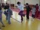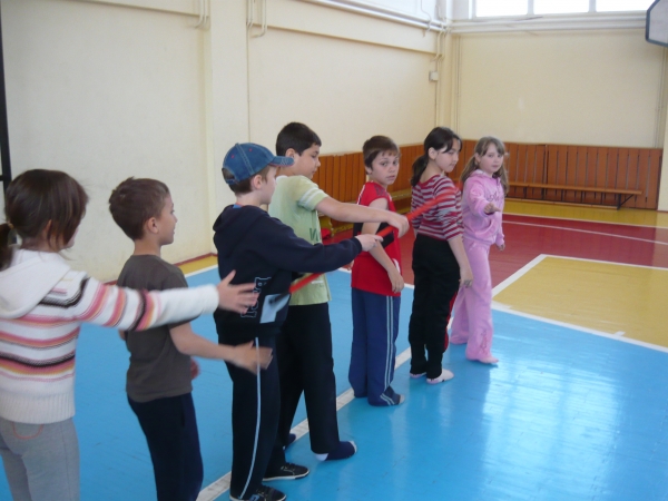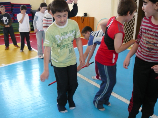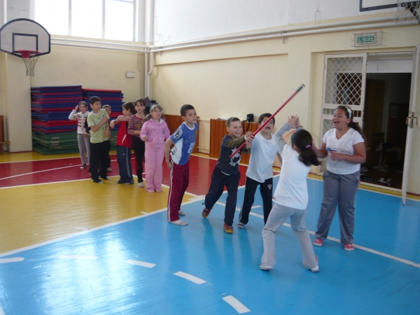 Descriere: Colectivul de elevi se imparte pe mai multe grupe, elevii asezandu-se in siruri. Primul din fiecare sir are un baston. La semnal, acesta alearga spre ultimul trecand bastonul pe sub picioarele tuturor elevilor din grupa. Acestia sar ridicand picioarele tuturor elevilor din grupa. Cand ajunge la ultimul elev, transmite bastonul din mana in mana pana la primul si se reia exercitiul. Grupa care termina mai repede castiga intrecerea.