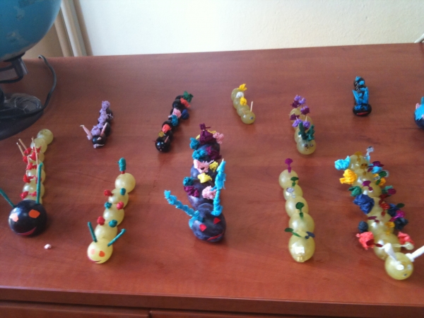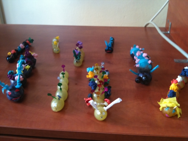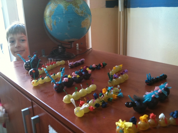 Descriere: Mancam fructe si legume, deci suntem sanatosi. Elevii clasei a-IV-a E au realizat omidute din boabe de struguri, prune si alte fructe.