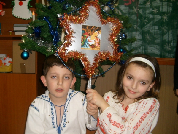 Descriere: Cei mai mici membri ai Clubului Sets din scoala noastra au colindat conducerea unitatii si cadrele didactice in preajma sarbatorior de iarna. Alex si Larisa au purtat "steua".