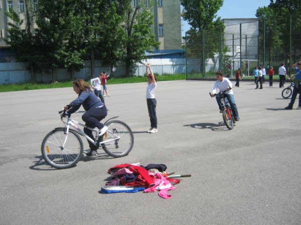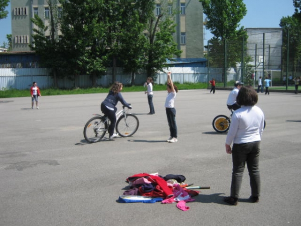 Descriere: Trei dintre colegii nostri si-au adus bicicletele. Ceilalti sapte au fost jaloane umane, au fost carati si pe biciclete (doamnei i s-a terminat bateria de la aparatul foto si n-a putut inregistra tot...), au facut galerie. Concursul de mers printre jaloane a fost grozav!