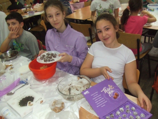 Descriere: Elevii cls a IV A impreuna cu d-na inv Nicu Catalina au adus ingredientele necesare pt a face bombonele Rafaello din aluat de biscuiti, cacao, nuca de cocos. Ei vor sa invete sa manance sanatos si sa aiba un mod de viata echilibrat.