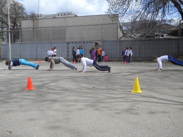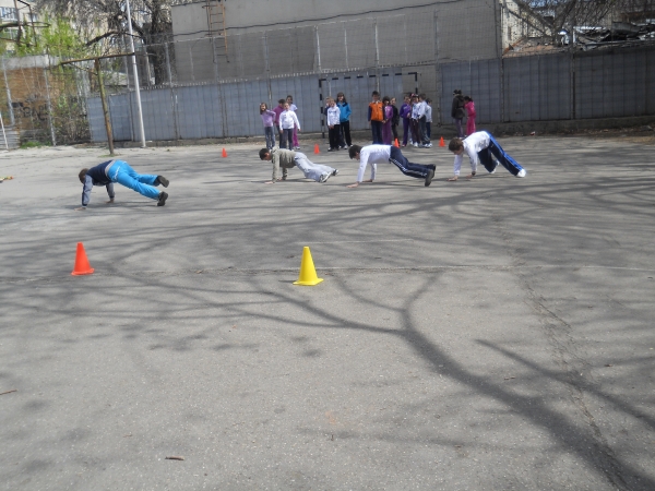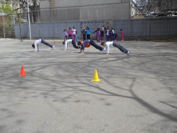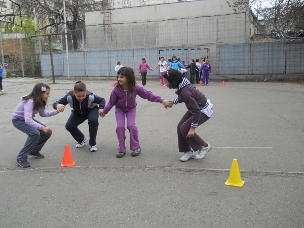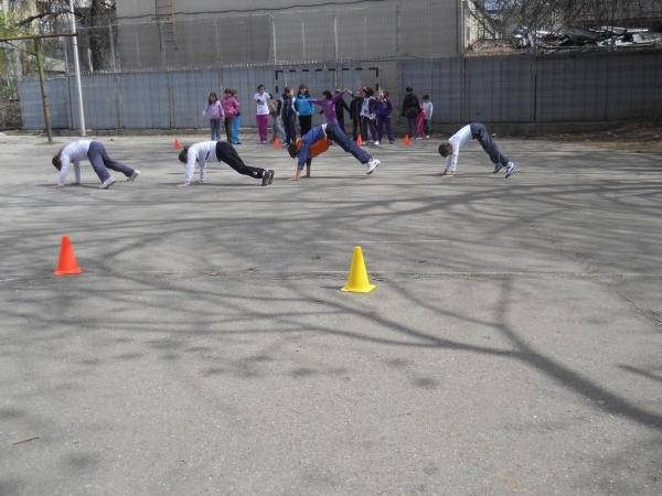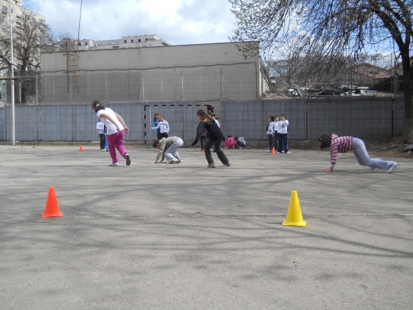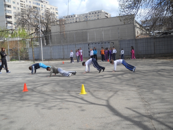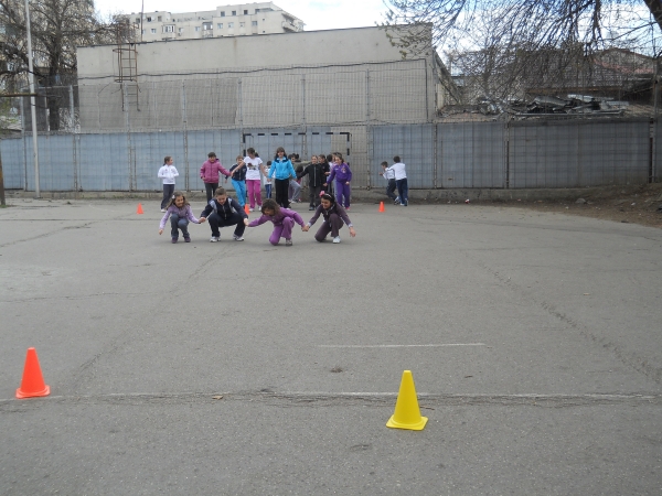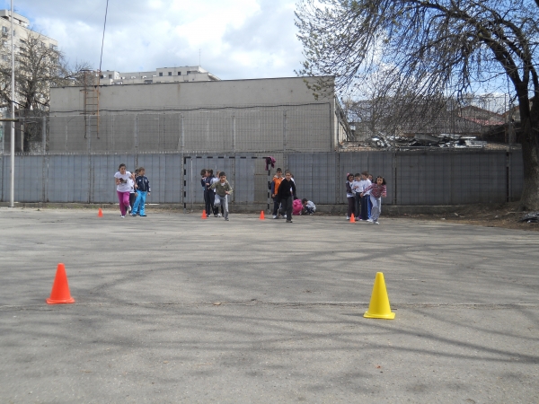 Descriere: Activitatile s-au desfasurat pe terenul de sport al scolii, in cadrul orelor de educatie fizica, sub atenta indrumare a doamnelor profesoare. Acestea au constat in: 1. Stafeta - asezati in formatie de cate patru elevi, unul in spatele celuilat, la semnalul sonor, am pornit in alergare de viteza pe o distanta de 20m, tinand stafeta in mana dreapta; dupa ocolirea jalonului ne-am intors si am predat stafeta urmatorului membru din echipa; 2. Dribling simplu cu mingea de baschet- la semnalul sonor se pleca, dribland cu mana dreapta, urmand ca la uramatorul semnal sonor driblarea sa se efectueze cu mana stanga, pe drumul de intoarcere; 3. Saritura cu coarda de gimnastica din alergare usoara; 4. Alergare cu ghemuire- Grupati cate doi, la semnalul sonor am plecat in alergare, tinandu-ne reciproc de maini. La mijlocul terenului ne-am oprit in pozitiz ghemuit. La semnalul sonor, ne-am ridicat si am continuat alergarea pana la linia de finish. 5. Alergare la semnal sonor pana la miijlocul terenului, traversand s-au asezat in pozitia de flotare s-au ridicat si au continuat alergarea dupa care s-au dus la coada sirului. 6. Joc de baschet 7. Joc de fotbal 8. Joc de handbal