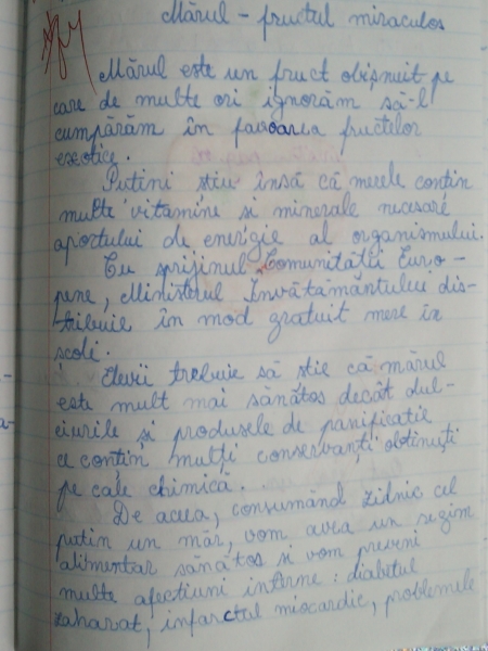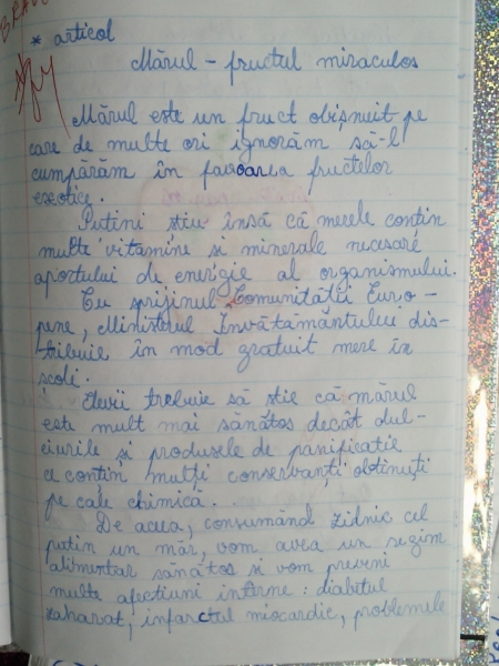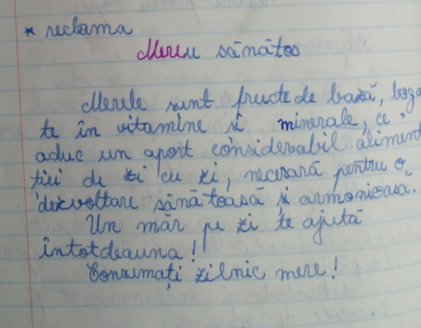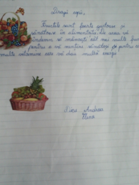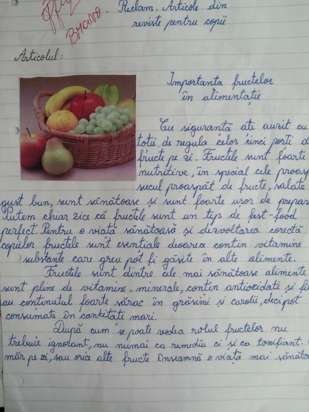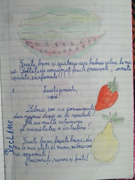 Descriere: Cunostintele noastre despre importanta unui regim alimentar sanatos,bogat in vitamine, le-am extins si in cadrul orelor de limba si literatura romana precum si in cea de educatie plastica, realizand astfel reclame, afise si articole despre importanta consumui de fructe, urmand ca ele sa fie publicate/lipite in revista scolii/prin scoala, scopul fiind acela de a-i convinge si pe colegii nostrii sa adopte acest stil de viata sanatos. Cateva imagini cu acestea v-am atasat si dumneavoastra.