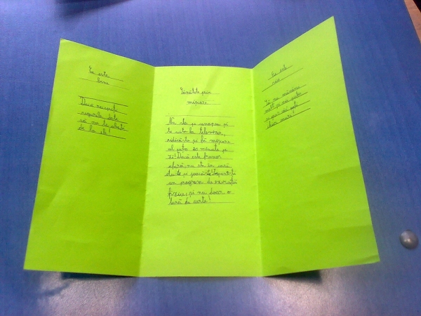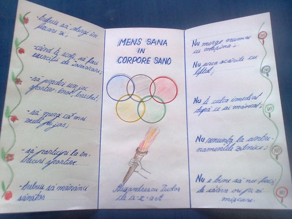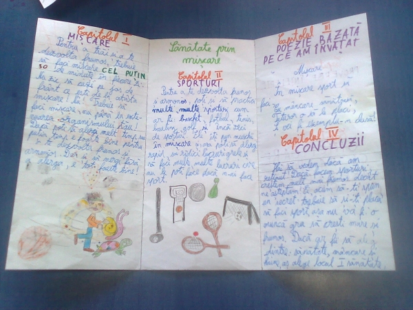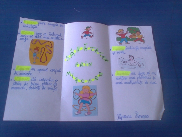 Descriere: Ploaia de afara si faptul ca sala de sport era ocupata nu ne-au descurajat.Membri clubului nostru s-au gandit sa realizeze niste pliante in care sa prezinte prin cuvinte,desen,culoare importanta miscarii pentru copii.Am obtinut niste pliante foarte interesante,realizate si gandite dupa dorinta fiecaruia. Cele mai reusite le-am afisat la coltul PRAIS-Cluburile de miscare din scoala noastra.Pe celelalte....aveti rabdare !Mai urmeaza activitati !