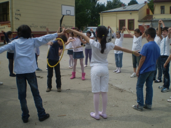 Descriere: Tot timpul inventam ceva nou. Acum alergam in cerc cu cercurile si incercam sa ne ferim de ceilalti. Agilitate, atentie, indemanare.