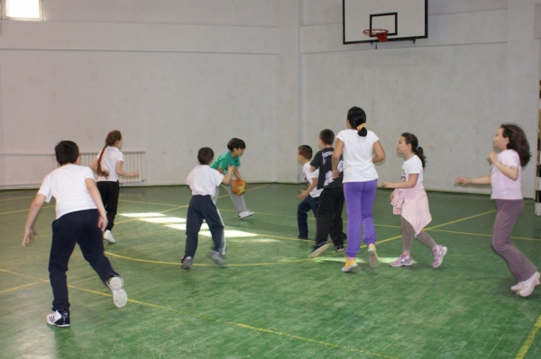 Descriere: Elevii au fost antrenati intr-un joc de baschet cu 4 echipe a cate 5 membri. Regula jocului a fost ca echipa care primeste cos sa iasa din joc si sa fie inlocuita cu alta de pe banca. Astfel, in timpul propus desfasurarii, toti cei 20 de elevi au participat la joc.