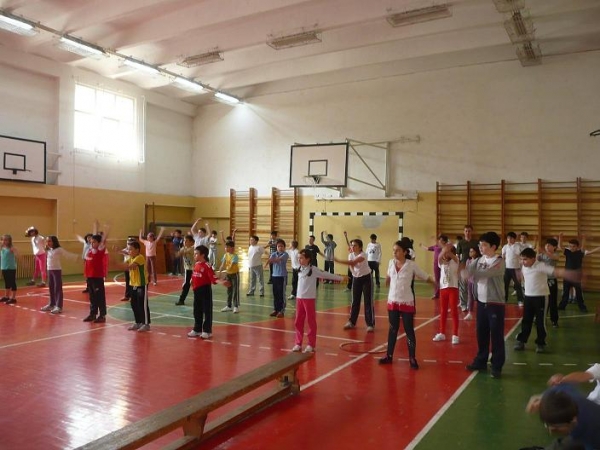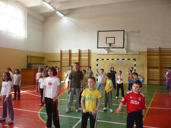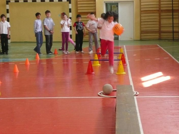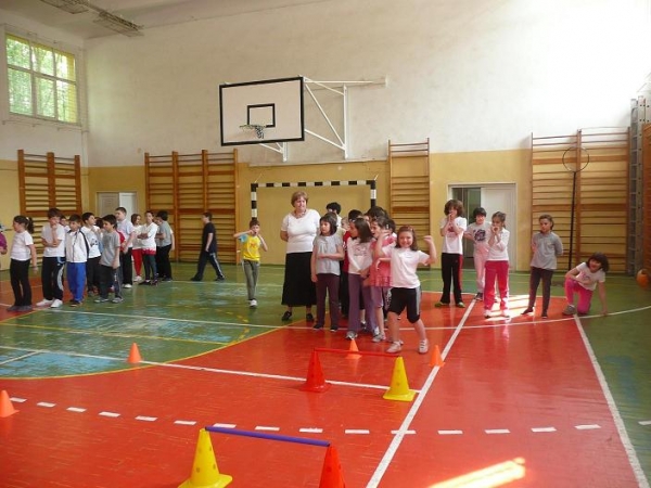 Descriere: Intrecere - traseu aplicativ combinat (alergare, saritura peste obstacole, mers in echilibru, conducerea mingii, aruncare la tinta) intre clasele IIID si IIC.