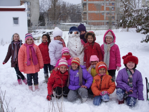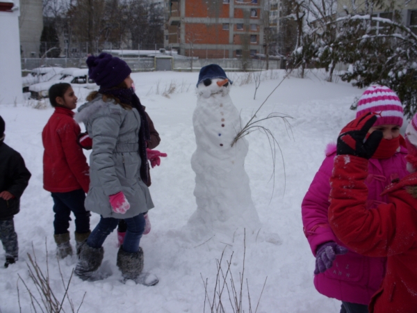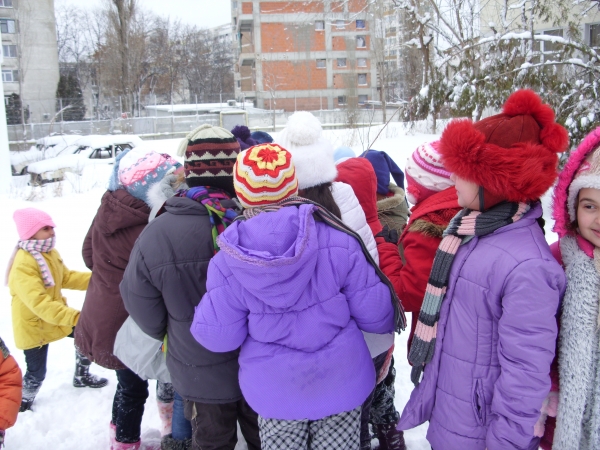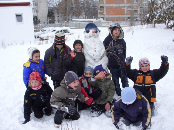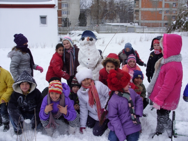 Descriere: Pentru ca afara ningea continuu de cateva zile iar zapada era tocmai buna de joaca le-am propus copiilor sa se gandeasca la o activitate distractiva, antrenanta pe care ar vrea sa o faca. A doua zi, deja aveau la ei: morcovi, un fular, o palarioara de pescar, ceapa si nasturi. Activitatea era legata de primii fulgi de nea si de zapada care scartaia sub picioarele lor. Dupa ce au finalizat omul de zapada, au profitat si s-au tavalit prin zapada, stiind ca un ceai cald ii astepta in scoala ca sa se incalzeasca.