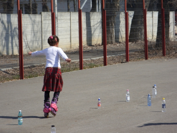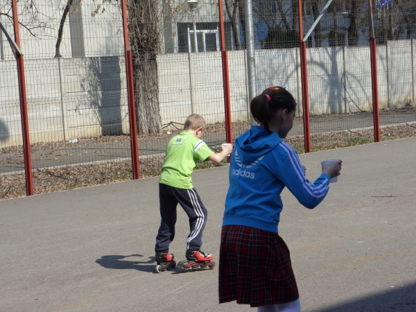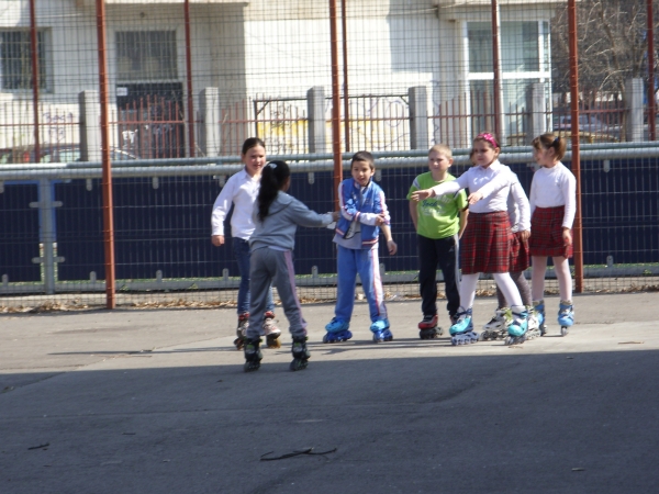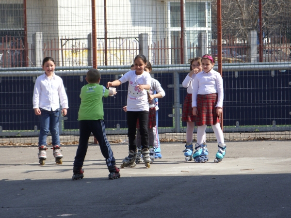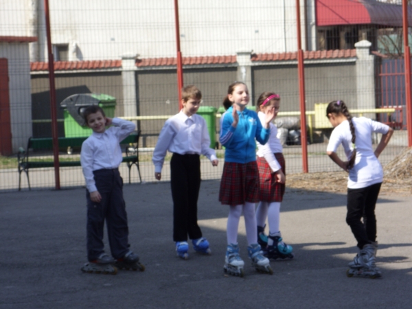 Descriere: Razele soarelui au prins putere iar noi am hotarat sa iesim in curtea scolii pentru o activitate distractiva. Toti cei cei din club aveau role prin urmare ne-am gandit sa organizam o competitie pe role. Ne-am sfatuit cu doamnele invatatoare si am stabilit ca dupa programul de scoala, sa ne schimbam din uniforme, apoi sa iesim in curtea scolii. Chiar daca multi dintre noi au au uitat de echipament, activitatea a fost captivanta: intrecere pe role, intrecere intre cei pe role si cei fara role, traseu cu capcane si stafeta cu pahare pline de apa.