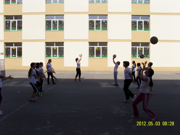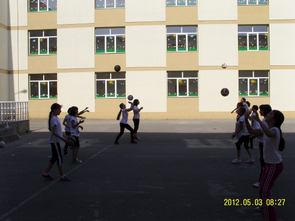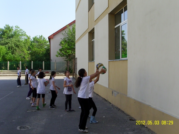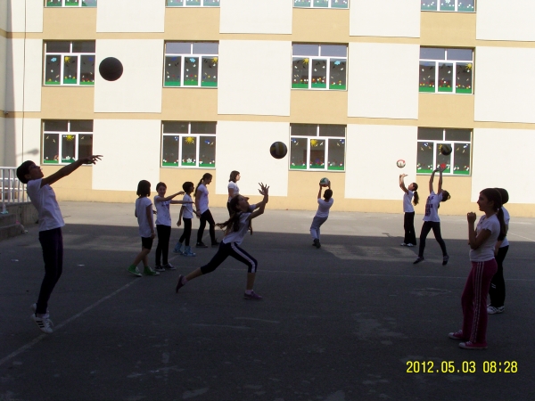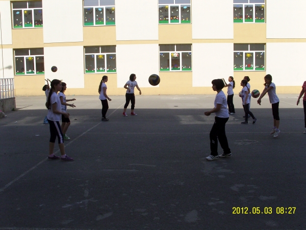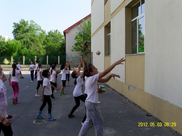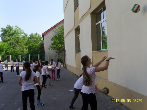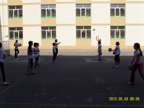 Descriere: Dupa exercitiile de incalzire ne-am impartit in doua echipe: echipa fetelor si echipa baietilor. In timp ce fetele au executat pase de volei, pase cu doua maini de sus, pase de control si pasarea mingii, invatarea pasei cu doua maini de sus pe spate si lovirea mingii in vederea pregatirii loviturii de atac, baietii au exersat asezarea in teren si pase de volei. Rolurile s-au schimbat si baietii au exersat diferite pase si lovituri de volei, iar fetele au exersat asezarea in teren si pase de volei.