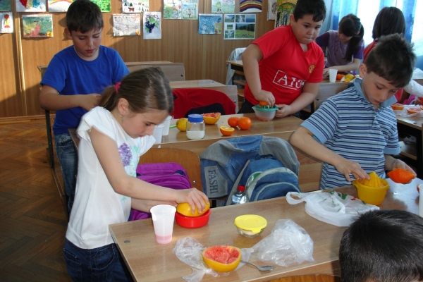 Descriere: Pentru o viata cat mai sanatoasa avem nevoie de o alimentatie sanatoasa. Fructele fac parte din ea, asa ca am preparat singuri un racoritor si delicios suc de citrice (portocale, mandarine, grapefruit, lamani). Am realizat si o grupare a produselor consumate de noi in mai multe categorii: fructe, legume, lactate, carne. Am avut si un invitat: un medic stomatolog care ne-a explicat cat de importanta este o alimentatie echilibrata pentru a avea dinti sanatosi.